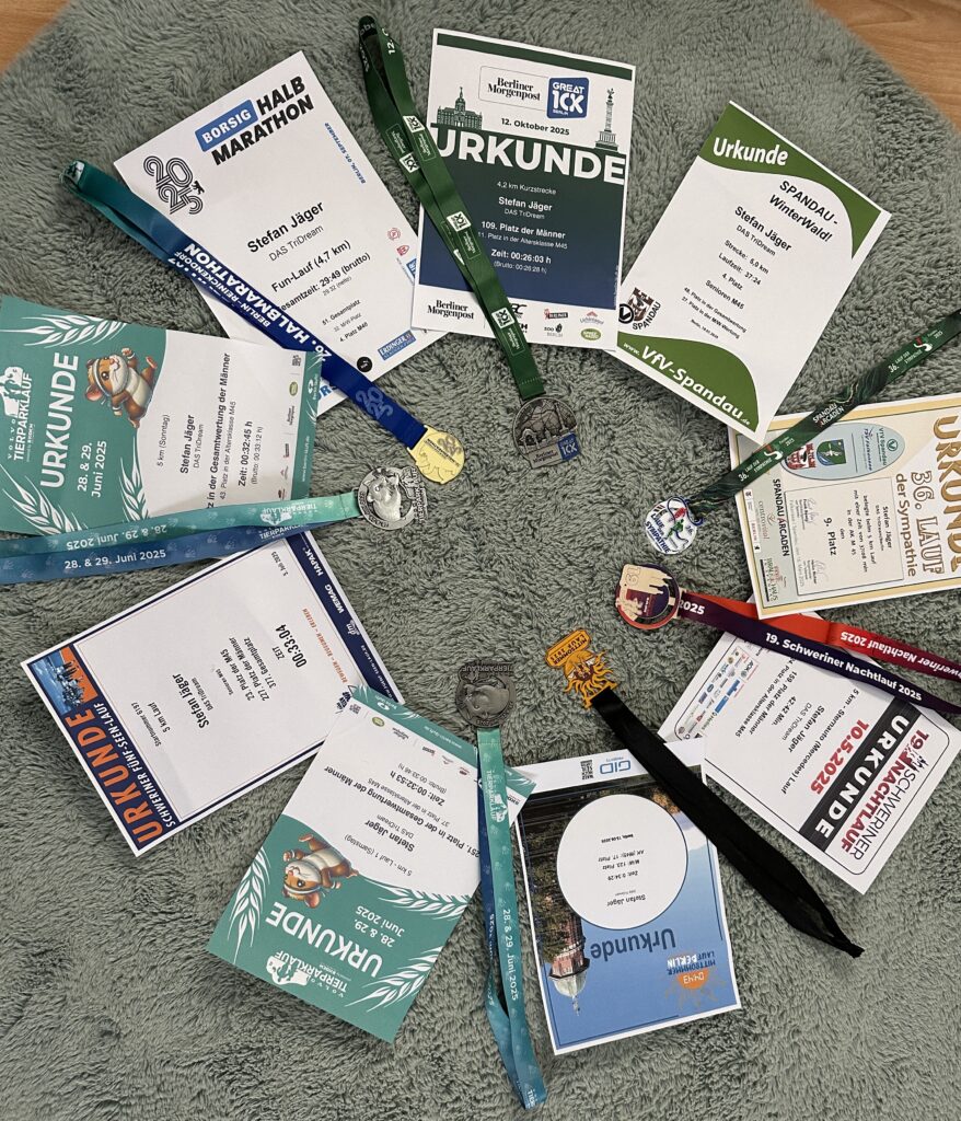 Ein Jahr nach meinem Neuanfang wollte ich wieder diesen schönen Lauf mitmachen. Nach meinem letzten Lauf in Reinickendorf wurde ich krank. Vorbereitung hatte nicht stattgefunden. Früh am morgen bin ich aufgestanden. Machte mich fertig und ging los zum Wettkampf. Mit dem Bus zum Bahnhof ging alles gut. Am Bahnhof habe ich aber meinen Zug, Plan A, nicht gesehen. Die Alternative war in 10 Minuten mit der S-Bahn Plan B oder 20 Minuten mit der Regionalbahn Plan C. Beides wäre zeitgleich beim Zielort. Also auf zur Regionalbahn. Irgendwann stand, dass die Regionalbahn Verspätung hatte. Also Plan B. Drüben angekommen, sah ich, dass mein erster Zug Plan A gleich ankommen sollte. Also wieder rüber. Durchsage von oben. Der Zug fällt wegen technischer Störung aus. In diesen Moment fuhr Plan B weg. Insgesamt hatte Plan C 20 Minuten Verspätung. Die Zeit war schon sehr knapp. Meinen Bruder anfeuern zu dürfen, klappte nicht. 5 Minuten vor Kleiderabgabe bin ich angekommen. Machte mich fertig und gab meine Sachen an der LKW-Shuttle ab. Eine halbe Stunde musste ich noch warten zum Start. Es waren 13 Grad und es regnete leicht. 5 Minuten vor dem Start bin ich auf die Toilette gegangen.