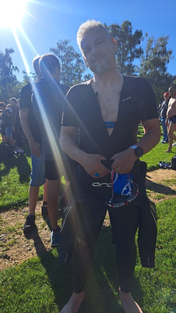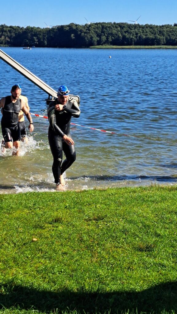 Der Start erfolgte um 9:25 Uhr und ich hatte vorab eine Wunschzeitliste erstellt und wollte unbedingt diese Zeile mit unter 2 Stunden erreichen. Im Wasser lief es richtig gut, die Brille funktionierte und der Neopren war die richtige Wahl.