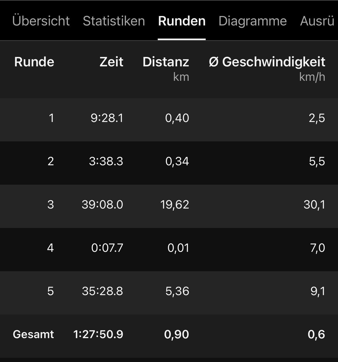 Soweit so gut. Das mysteriöse ist die Aufzeichnung der Strecken via GPS. Das die Schwimmstrecke nicht stimmte ist okay, schließlich wurde via GPS und nicht mit der Schwimmbadfunktion gemessen. Lauf in und aus der Wechselzone auch perfekt. Aber mit dem Aufstieg aufs Rad war der Wettkampf beendet. Und genau das ist mir völlig unverständlich. Wenn doch alle 5 Abschnitte weitgehend korrekt gemessen wurde, warum war das Rennen gemäß GPS Aufzeichnung schon beim Radaufstieg beendet? Ich könnte ja verstehen, dass dass die GPS Aufzeichnung falsch ist, aber stoppt und den Radaustieg als Ziel markiert, obwohl die Zeit korrekt weiterläuft?